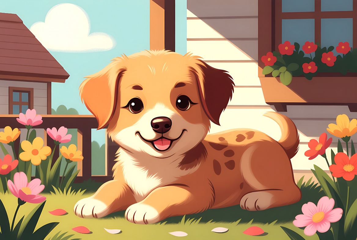 blue sky, brown, cheerful, colorful, cute, dog, flowers, garden, grass, home, nature, outdoor, paws, pets, playful, resting, small dog, sunlight, sunny, wooden house