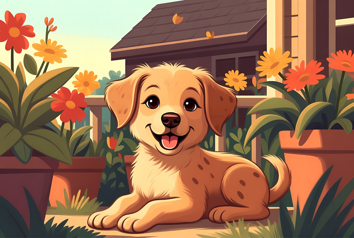 animal, bright, brown, cute, dog, flowers, foliage, garden, happy, home, nature, outdoor, pet, playful, potted plants, scene, sitting, smiling, summer, sun