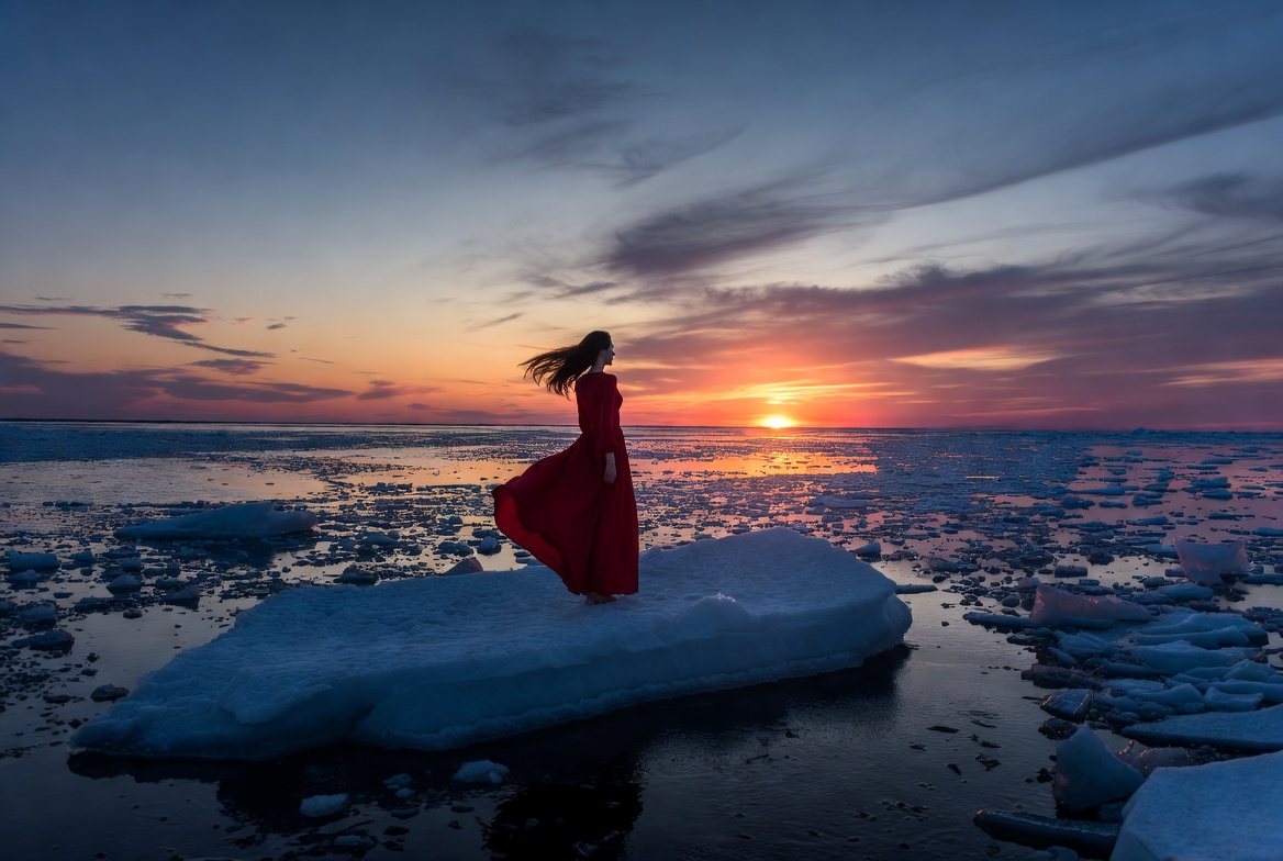 A woman stands on an ice piece at sunset. She wears a long red dress as the sky turns orange and purple over the water.