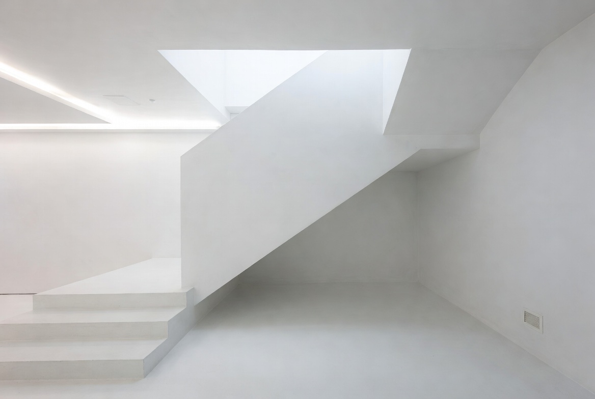 angles, architecture, bright, clean, contemporary, design, flooring, interior, light, minimalism, modern, room, shadows, skylight, space, staircase, steps, upper area, walls, white