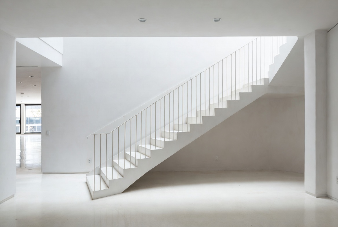 aesthetic, architecture, building, clean, contemporary, design, empty, floor, home, interior, light, minimalism, modern, railing, space, staircase, steps, walls, white, windows