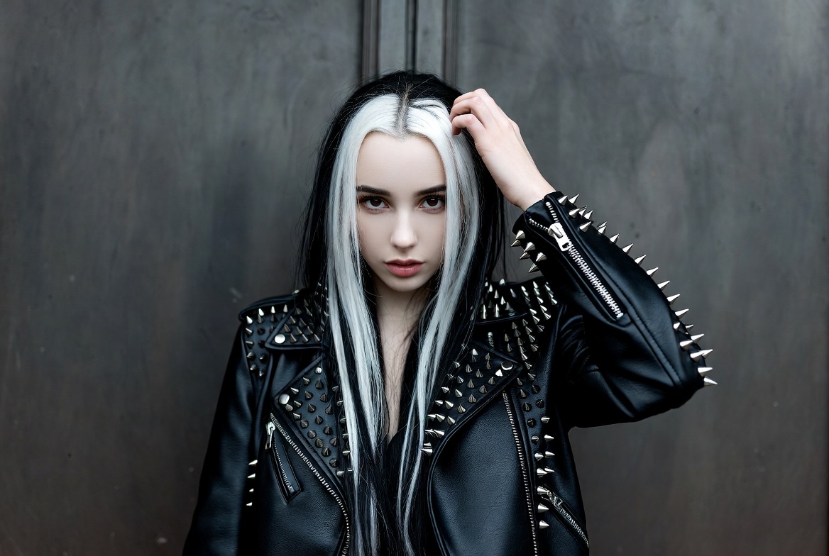 A young person poses with black and white hair while adjusting their hairstyle in front of a dark wall. The individual wears a spiked leather jacket.