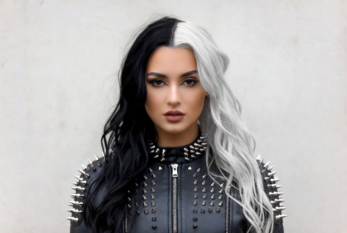 A woman with black and white hair stands in front of a plain background. She wears a spiked leather jacket and looks directly at the camera.