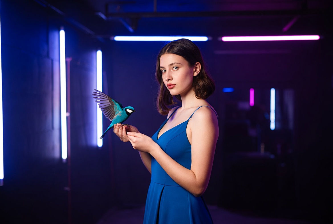 art, beauty, bird, blue, colorful, creativity, dress, evening, exotic, expression, fashion, holding, indoor, model, neon lights, nightlife, portrait, studio, wildlife, young woman