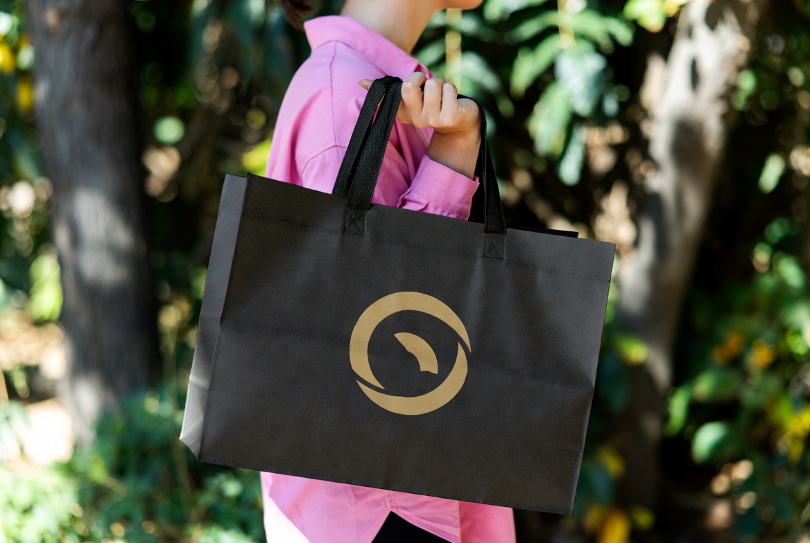 bag, black, carry, casual, casual wear, color, design, environment, leisure, lifestyle, logo, nature, outdoor, park, person, plants, shopping, standing, sunny, trees