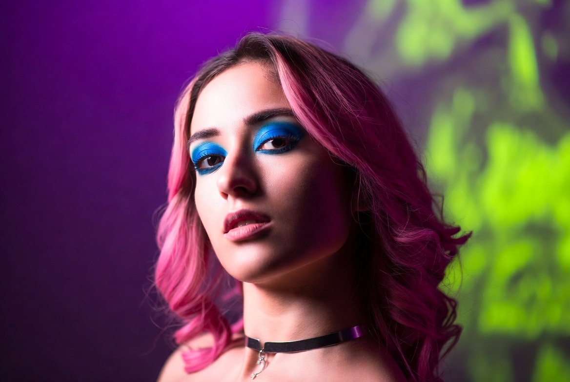 beauty, close-up, colorful, colorful background, creativity, expression, eyes, fashion, hairstyle, lighting, makeup artist, model, modern, nightlife, person, pink hair, portrait, standing, studio, woman