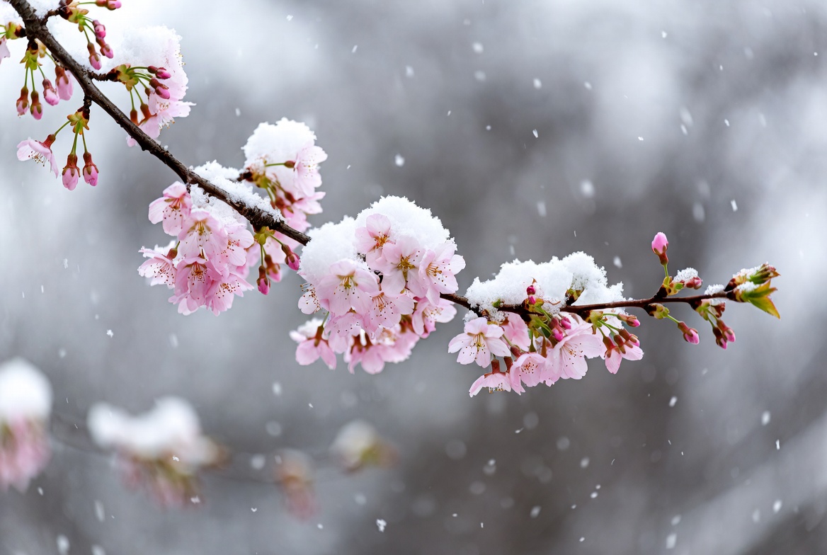 Cherry blossoms are covered in snow during winter. Light snowflakes fall around the branches, creating a mix of pink and white.