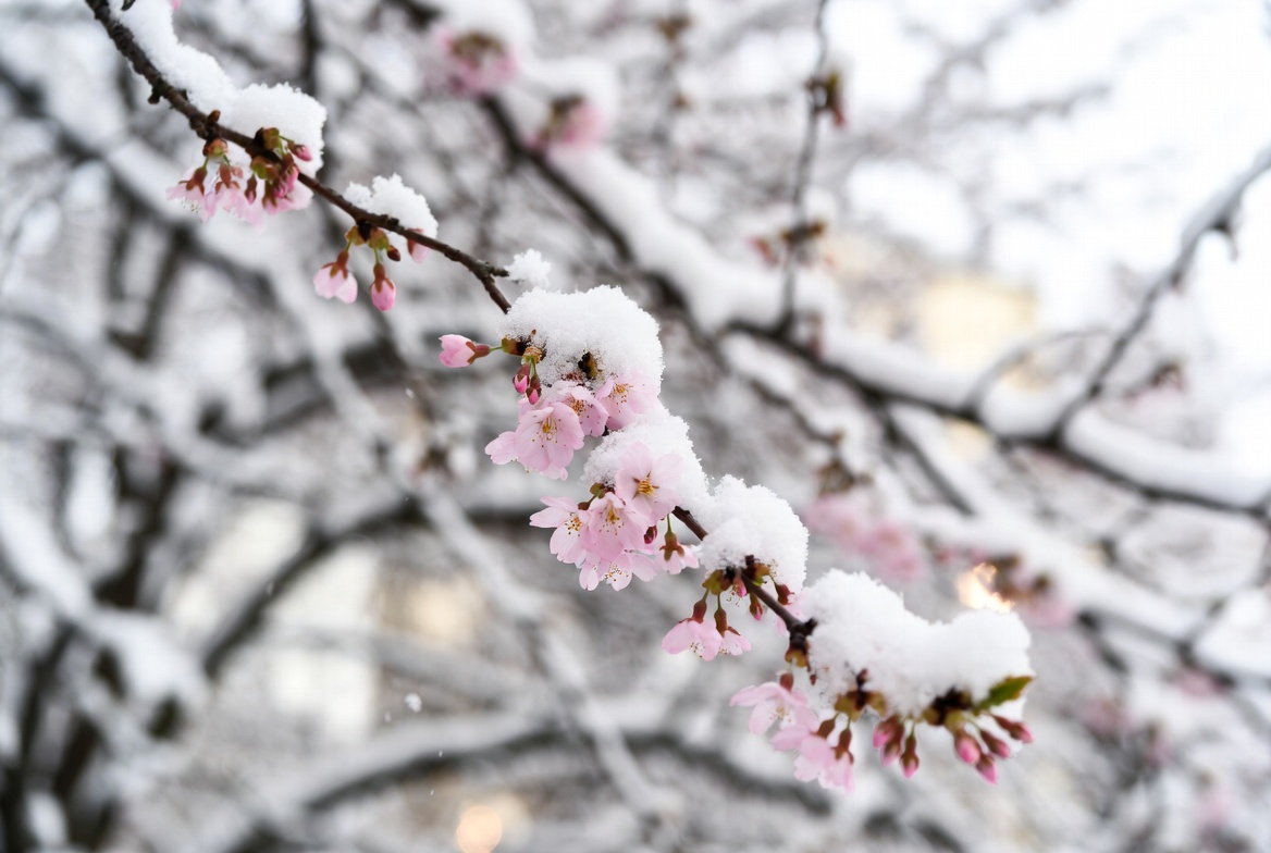 beautiful, bloom, branches, cherry blossoms, cold, flowers, landscape, nature, outdoor, park, petals, pink, scenery, season, snow, trees, urban, weather, white, winter
