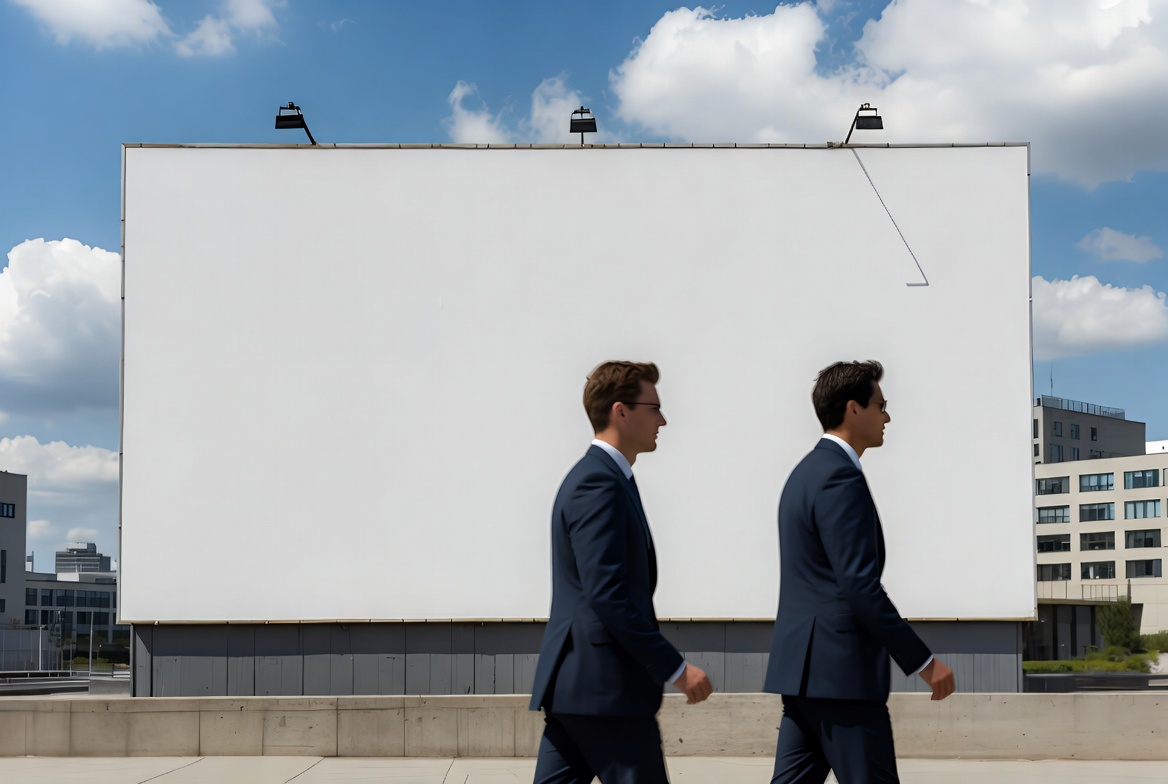 Two men in suits walk by a large blank billboard while buildings and clouds fill the background on a clear day.