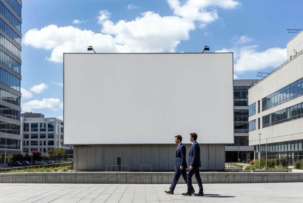 Two men dressed in suits walk side by side near a large empty billboard in an urban area during the day with a blue sky.