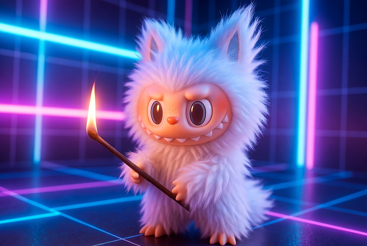 A small, fluffy creature stands on a grid with neon lights. It holds a stick with a small flame. The background glows in bright colors.