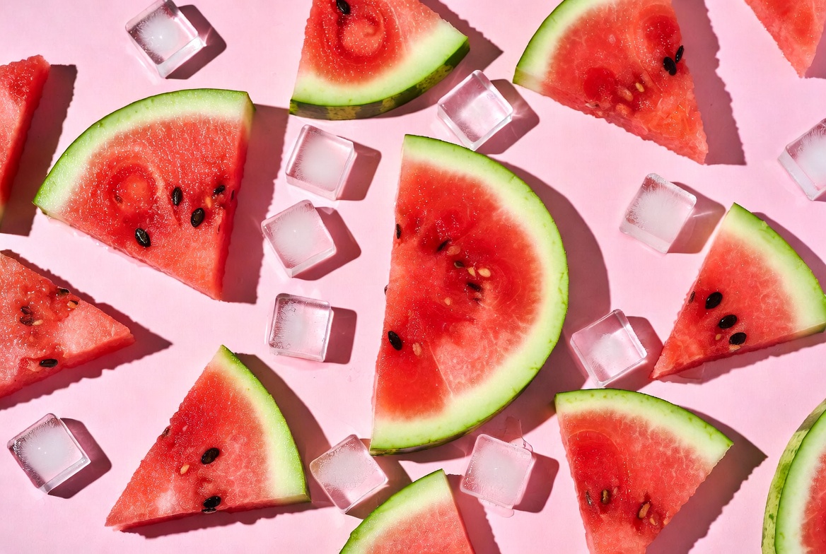 arrangement, background, colorful, dessert, food, fresh, fruit, healthy, hydration, ice cubes, leisure, party, picnic, pink, refreshing, slices, snack, summer, tasty, watermelon