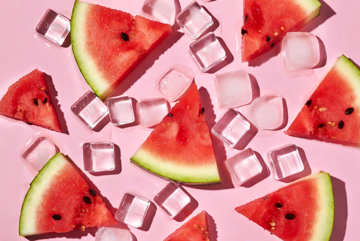 Pieces of watermelon and ice cubes are arranged on a pink surface, creating a colorful and refreshing display suitable for summer.