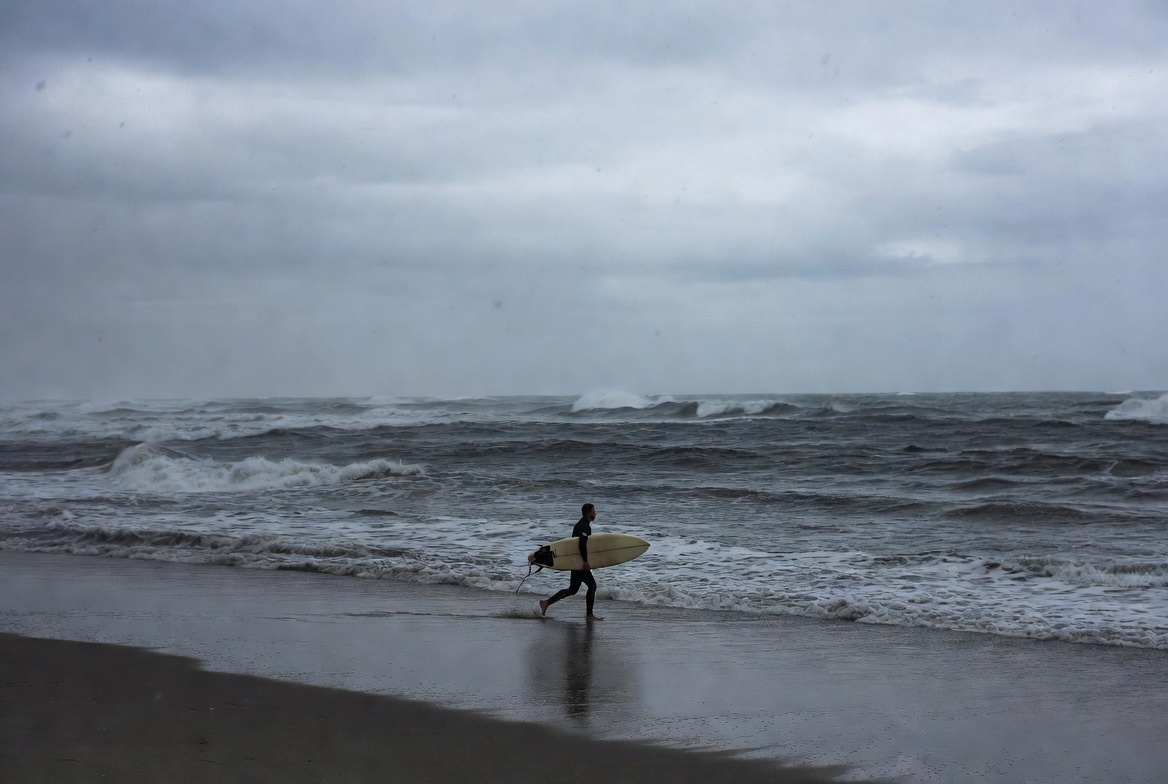 activity, adventure, athlete, beach, clouds, cloudy, coastline, nature, ocean, recreation, running, sand, sea, shore, sports, surfboard, surfer, water, waves, wind