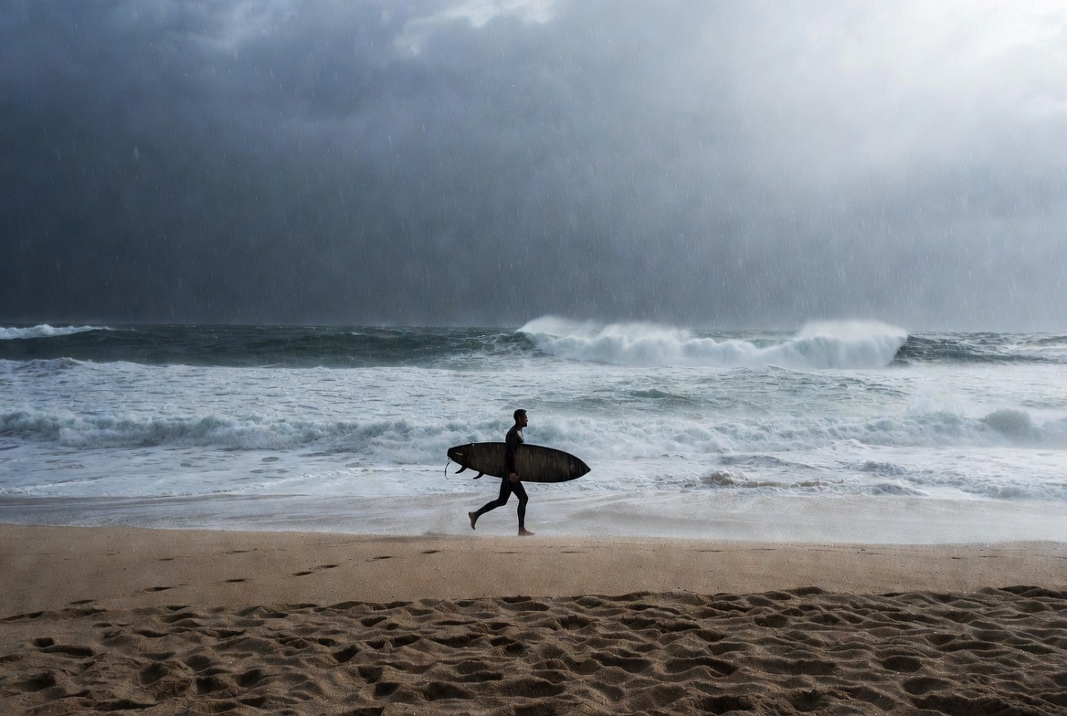 activity, beach, clouds, coastal, nature, ocean, person, rain, recreation, sand, seaside, sports, stormy, surfboard, surfer, surfing, walking, water, waves, weather