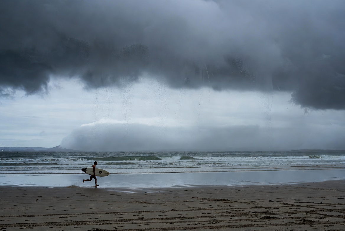 activity, beach, clouds, coastline, horizon, movement, nature, ocean, outdoors, rain, running, sea, shoreline, sky, storm, surfboard, surfer, water, waves, weather