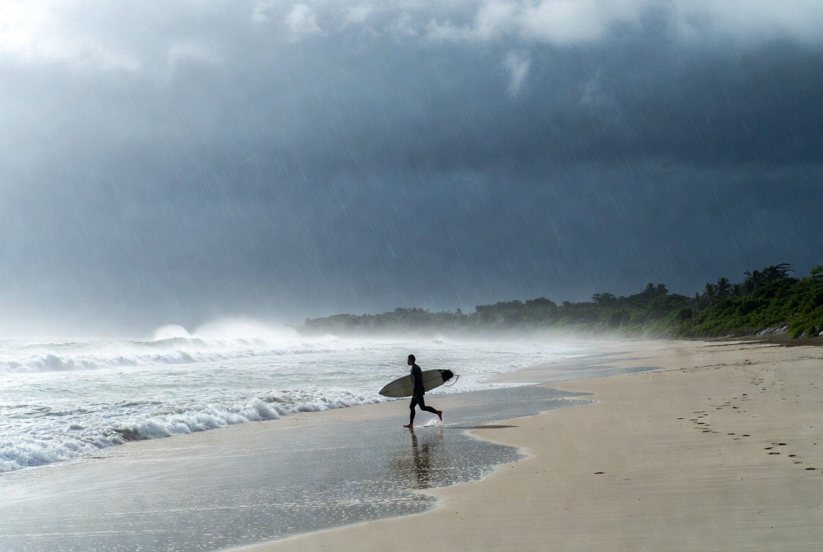 A surfer walks on the wet sand by the shore as dark clouds gather in the sky. Waves crash nearby, creating mist and a sense of impending rain.