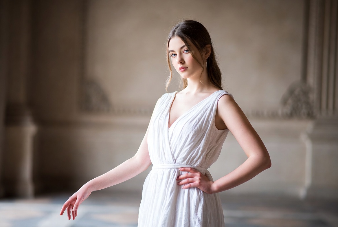 architecture, backdrop, beautiful, casual, dress, elegance, fashion, graceful, indoors, light, model, natural light, posing, room, serene, simple, standing, styling, woman, young
