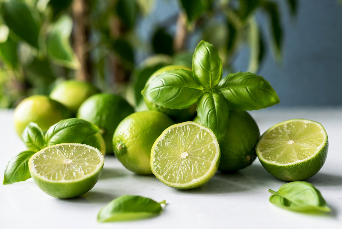 aroma, basil, bright, citrus, cooking, flavor, food, fresh, green, half, healthy, ingredients, kitchen, limes, natural, nature, plants, produce, summer, table