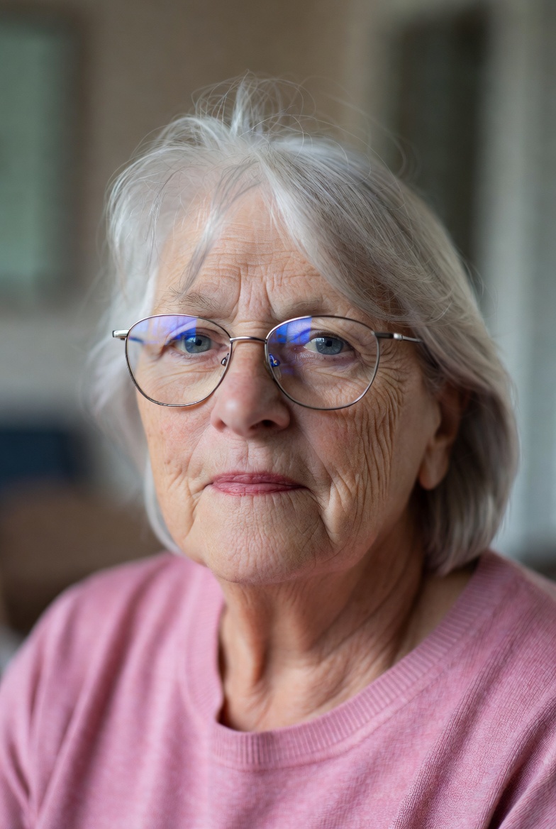age, casual attire, close-up, elderly, elderly person, expression, glasses, gray hair, home, home environment, indoor, living space, mature, natural light, portrait, senior woman, sitting, skin texture, sweater, thoughtful