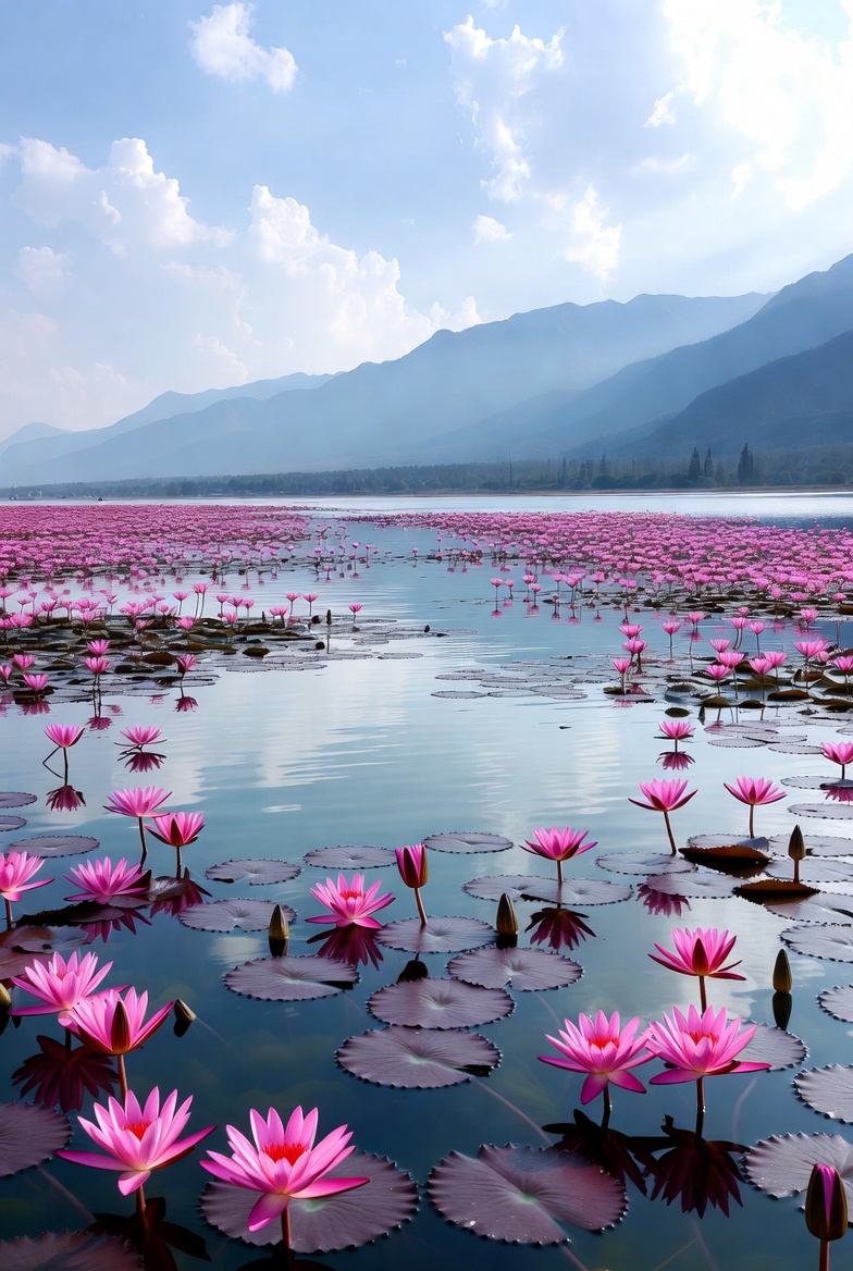 Pink lilies float on the surface of the lake under a blue sky with clouds. Mountains are seen in the background during daylight.