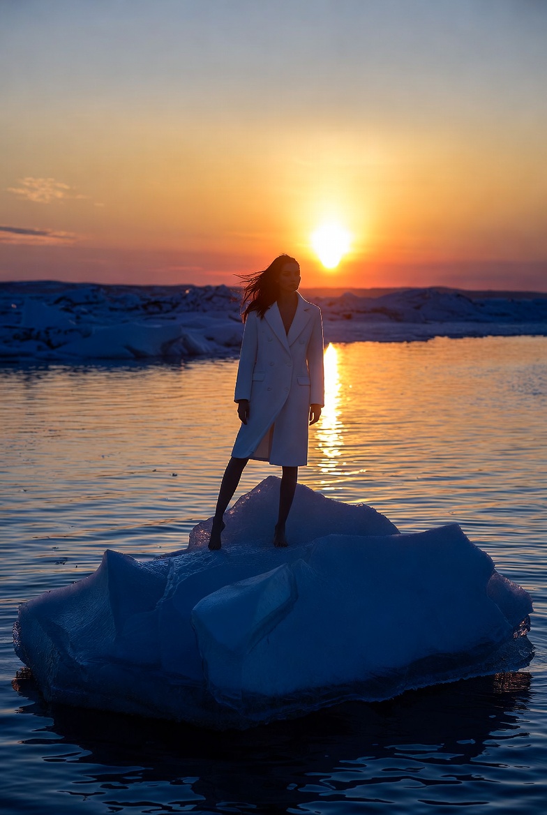 beauty, cold, elegance, fashion, freeze, ice, landscape, nature, ocean, outdoors, pose, reflection, scene, silhouette, sky, sunlight, sunset, water, winter, woman
