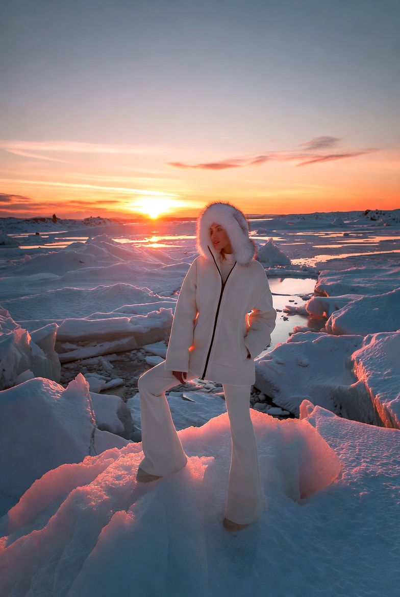 A woman stands on a patch of ice wearing a white outfit as the sun sets over melting ice. The sky displays shades of orange and blue.