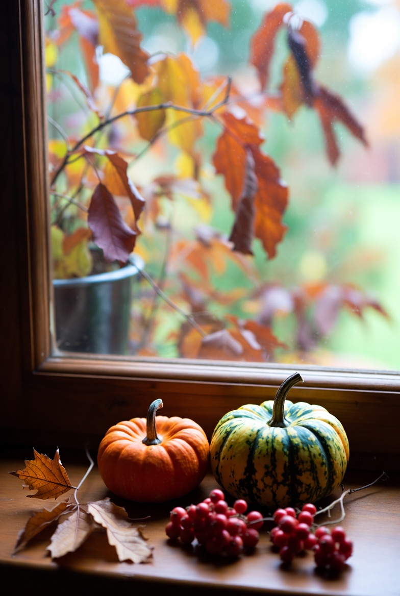 Two pumpkins sit on a wooden surface by a window. Outside, leaves change color, signaling the arrival of autumn. Red berries add detail.
