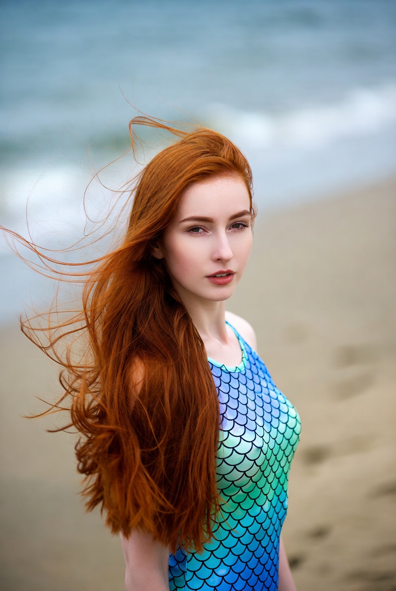 A woman with long red hair stands on the beach near the ocean. Her outfit has a scale design and the wind blows her hair.