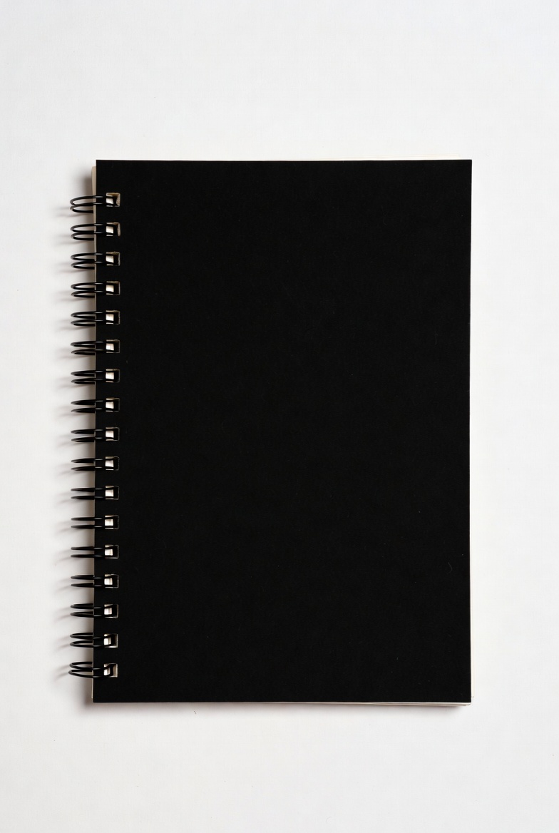 black notebook, blank notebook, isolated background, journal, office supply, product photo, spiral bound, spiral notebook, stationery, white background, writing pad, notebook