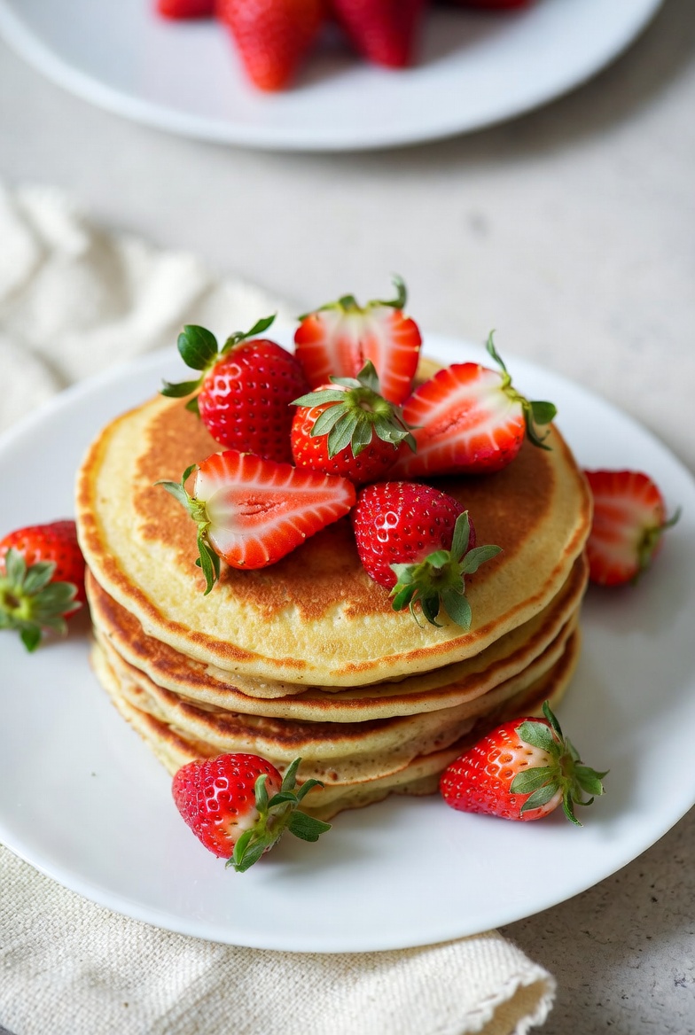 A stack of four golden pancakes sits on a white plate, topped with vibrant red strawberries and green leaves. Additional strawberries are scattered around the plate on a light gray surface. A white cloth napkin is visible in the background.