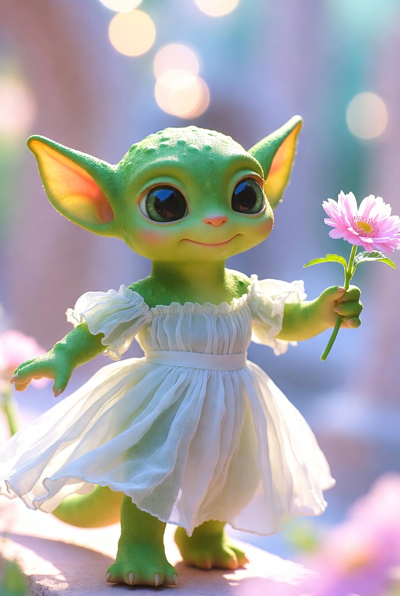A cute green goblin girl with large pointed ears and big expressive eyes holds a pink daisy flower. She wears a delicate white off-shoulder dress with ruffled sleeves and skirt. The image features a dreamy purple bokeh background with floating pink petals.