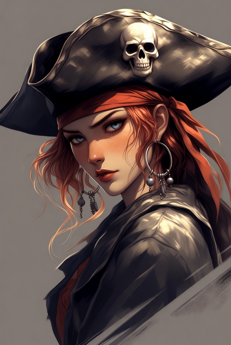 A pirate woman stands confidently. She wears a black hat with a skull and has red hair. Her expression shows strength and determination.