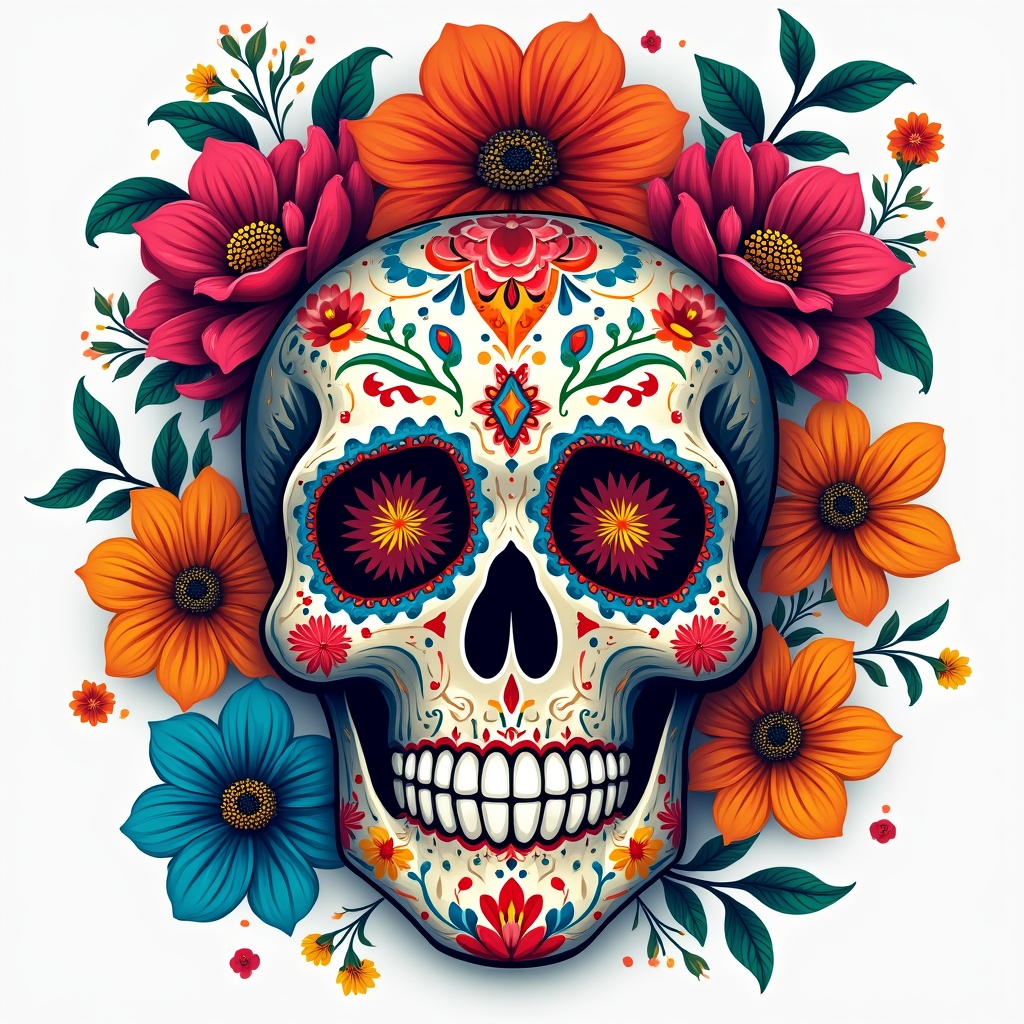 Colorful skull decorated with flowers. It features bright patterns and various types of flowers surrounding it.