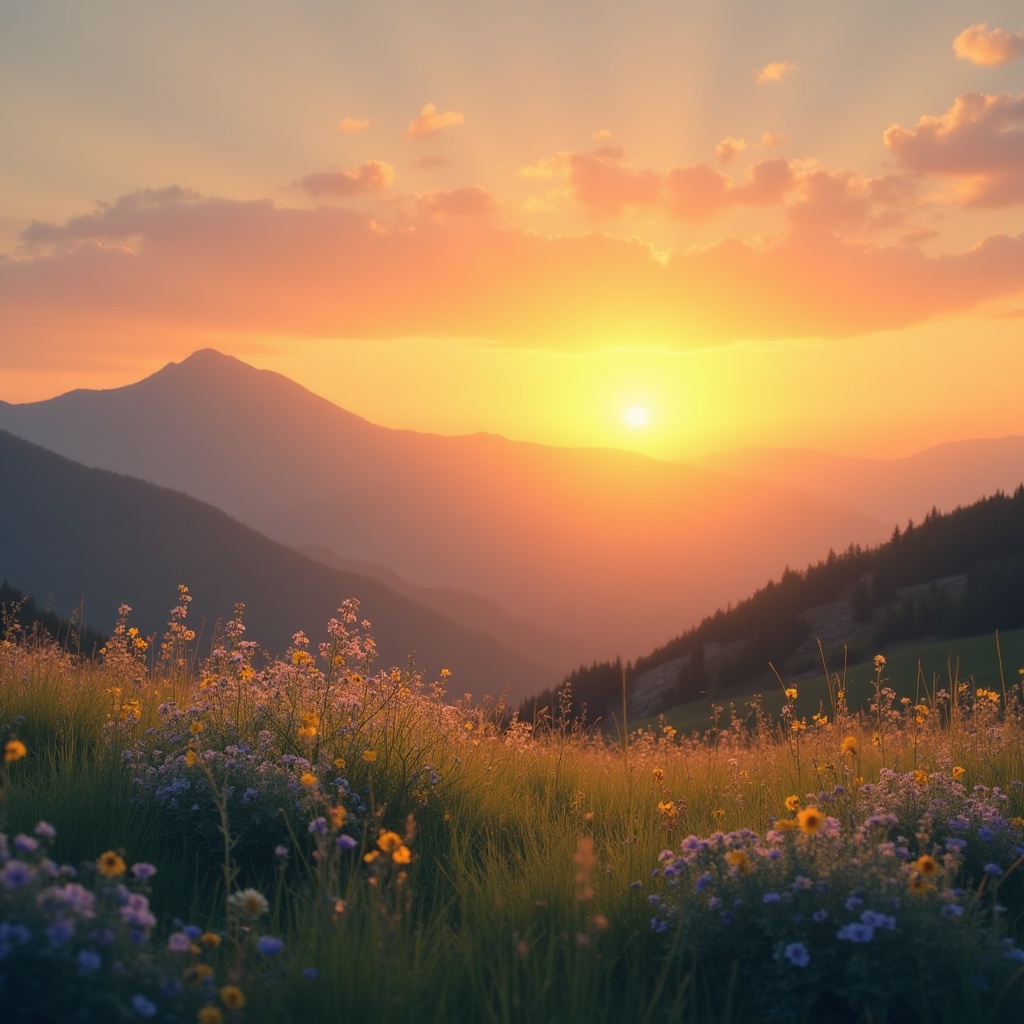 Sunset lights up the mountains while flowers bloom in a field. The scene shows warm colors and a peaceful atmosphere at dusk.