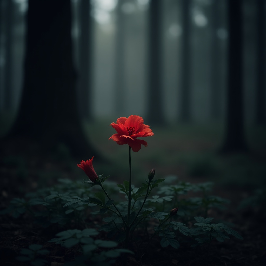 A bright red flower stands out alone in a dark forest. Tall trees surround it, creating a shadowy atmosphere with little light.