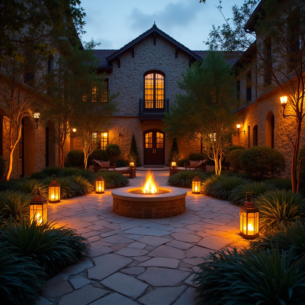 Elegant courtyard illuminated by lanterns in the evening