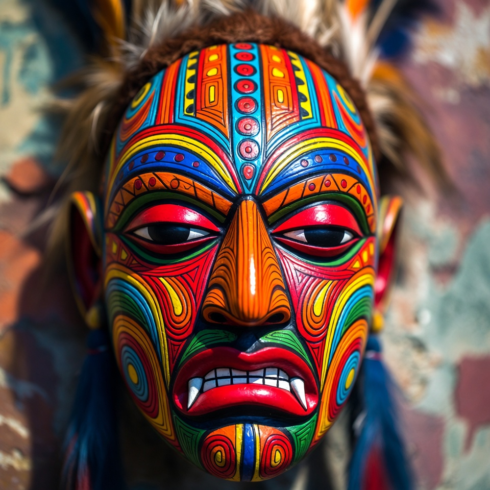 A bright mask with intricate designs is displayed on a wall. The mask features many colors and patterns, showcasing cultural artistry.