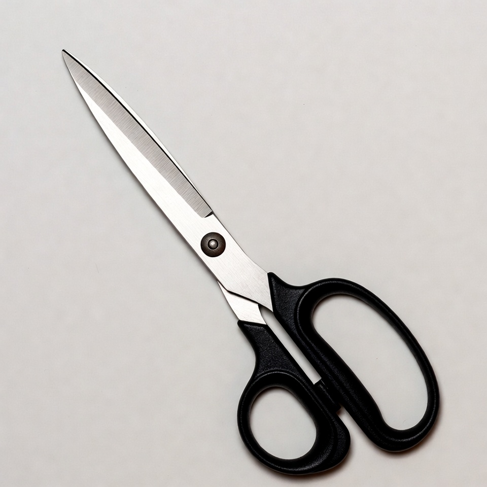 A pair of metal scissors with black handles sits on a light surface ready for cutting tasks.