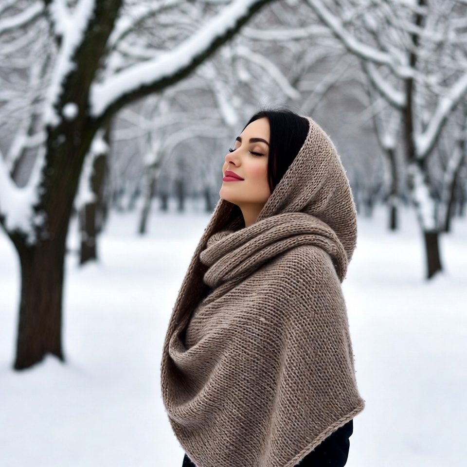 A woman stands in a snowy park with trees covered in white. She wears a warm shawl and appears to savor the winter chill.