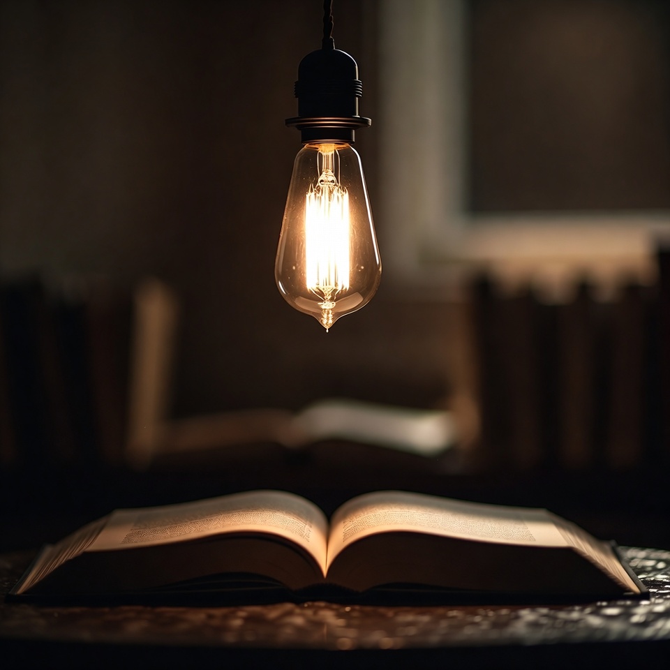 A warm light bulb hangs above an open book on a table. The setting is cozy and invites reading or sharing stories.