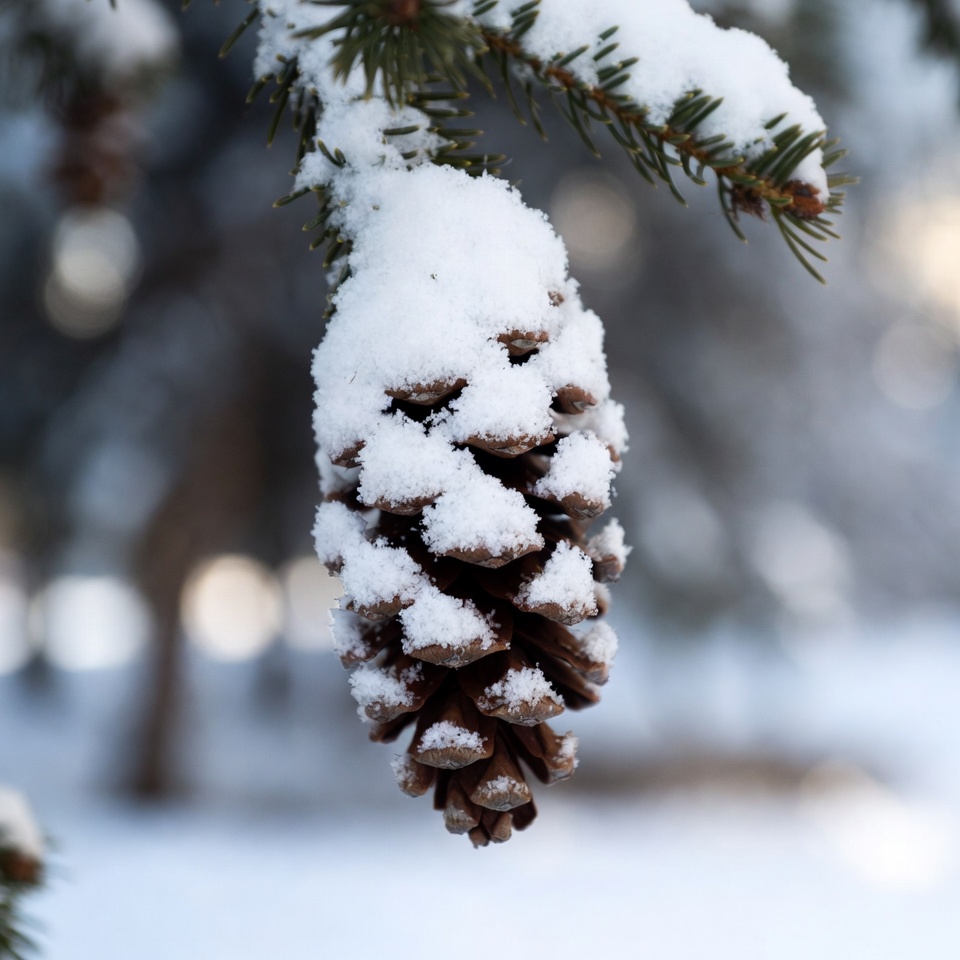 Pinecone hanging in winter snow