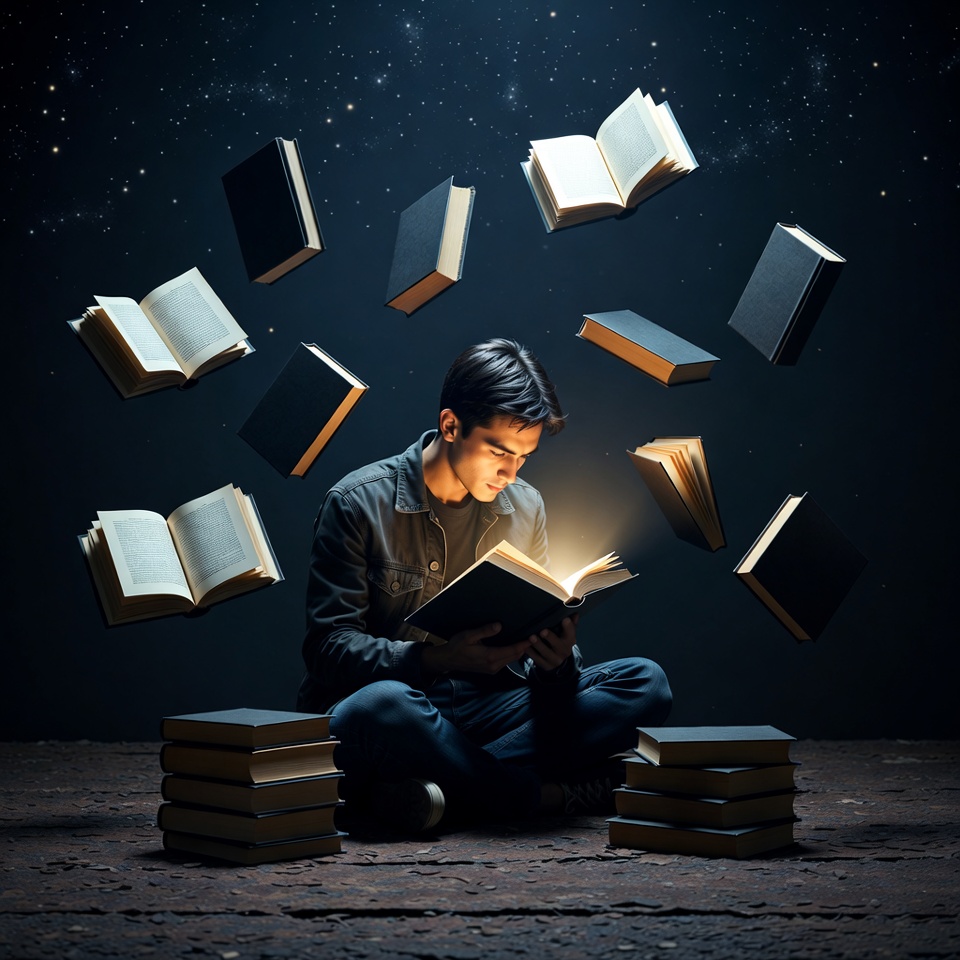 activity, books, concentration, dark space, education, enjoyment, figure, floating, floor, imagination, knowledge, learning, light, literacy, mystery, pages, quiet, reading, studying, young man