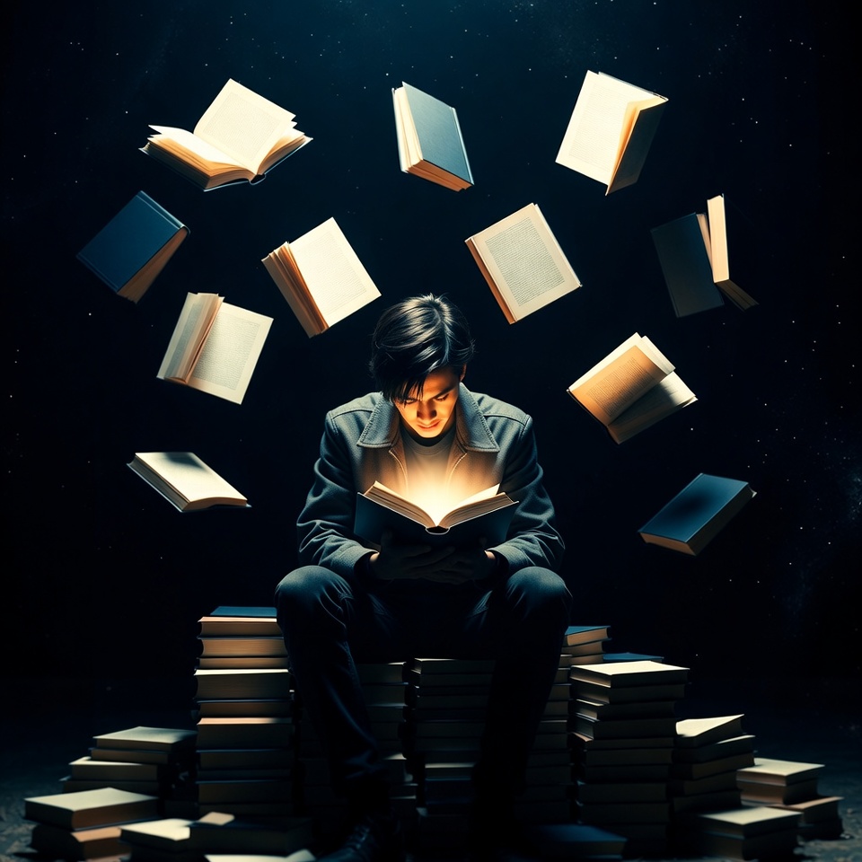 A boy sits on a stack of books while reading one. Books hover in the air around him, creating a scene of focus and imagination.