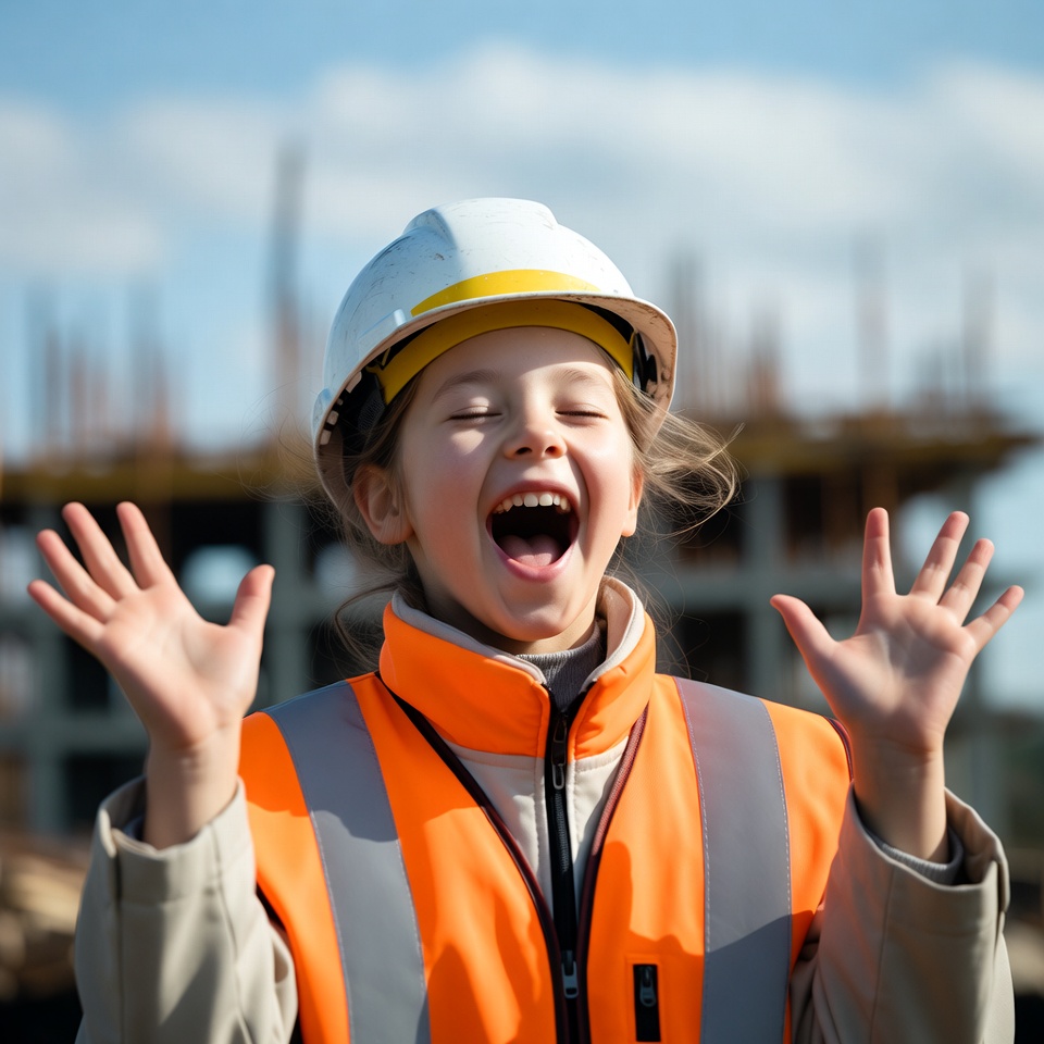 A young girl wears a hard hat and safety vest at a construction site. She smiles and raises her hands happily under a blue sky.