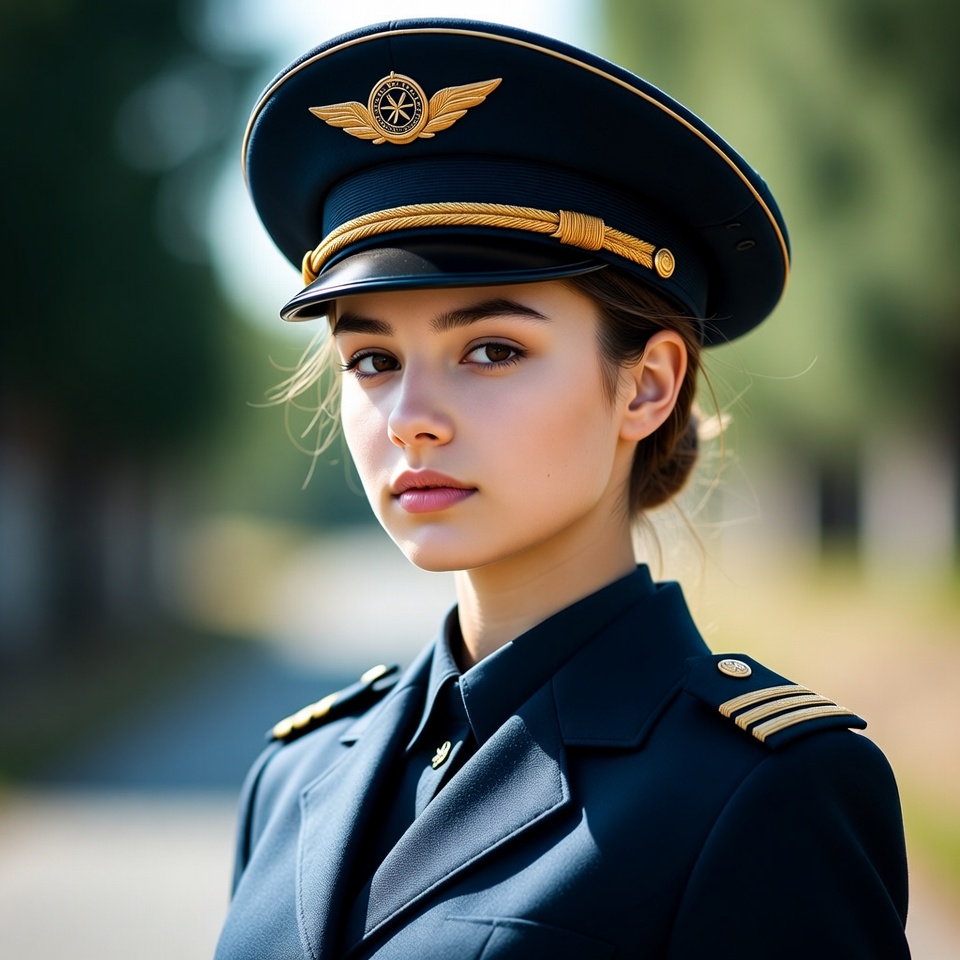 air travel, aviation, career, clear sky, confidence, expression, flight, hat, nature, officer, outdoor, pathway, people, pilot, professional, standing, training, trees, uniform, young woman
