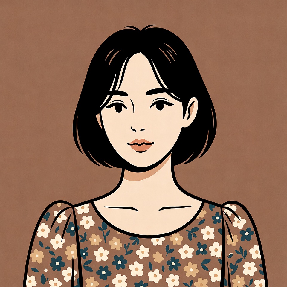 beauty, brown background, casual wear, character, creative, fashion, feminine, floral dress, girl, illustration, indoor, modern, neutral expression, outfit, portrait, short hair, simple design, style, woman, youth