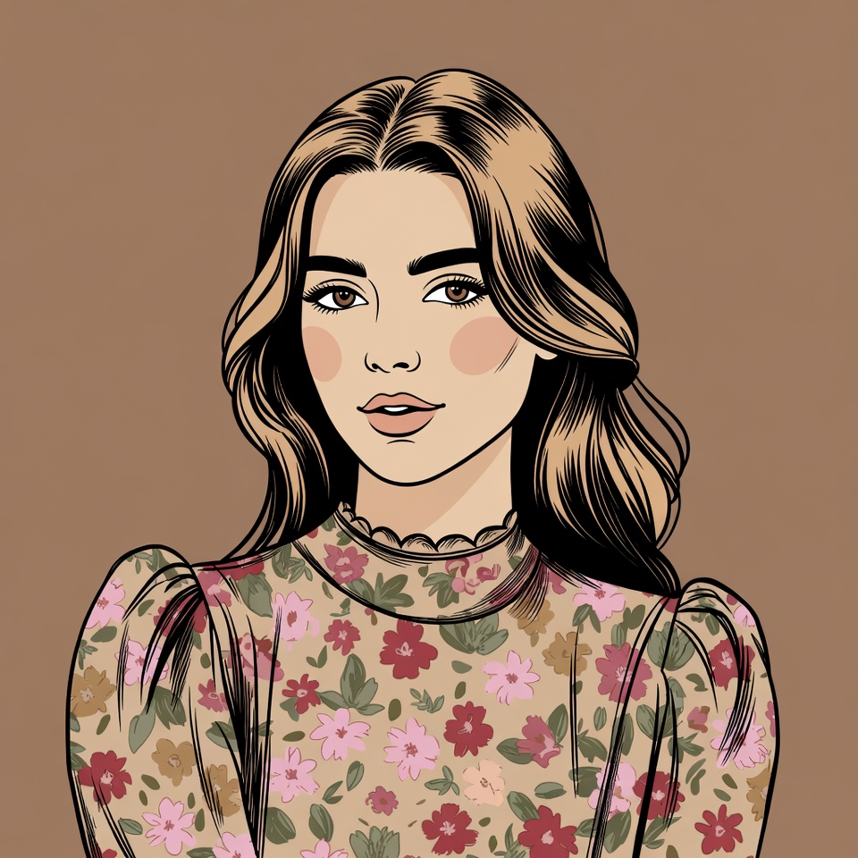 A young woman poses with long hair and a floral dress. The background is a simple brown color, highlighting her features and outfit.