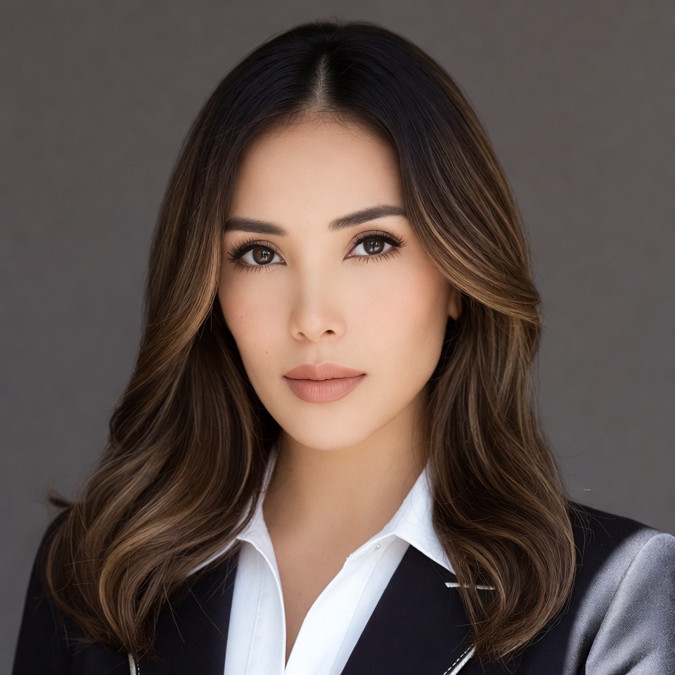 A woman with long hair poses for a close-up portrait. She wears a formal outfit and stands against a neutral background.