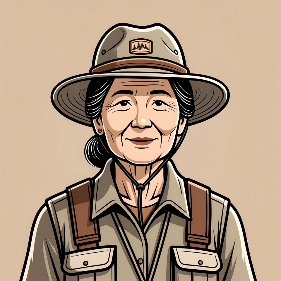 An older woman dressed in work clothes stands confidently with a hat. This scene shows her ready for outdoor activities in nature.